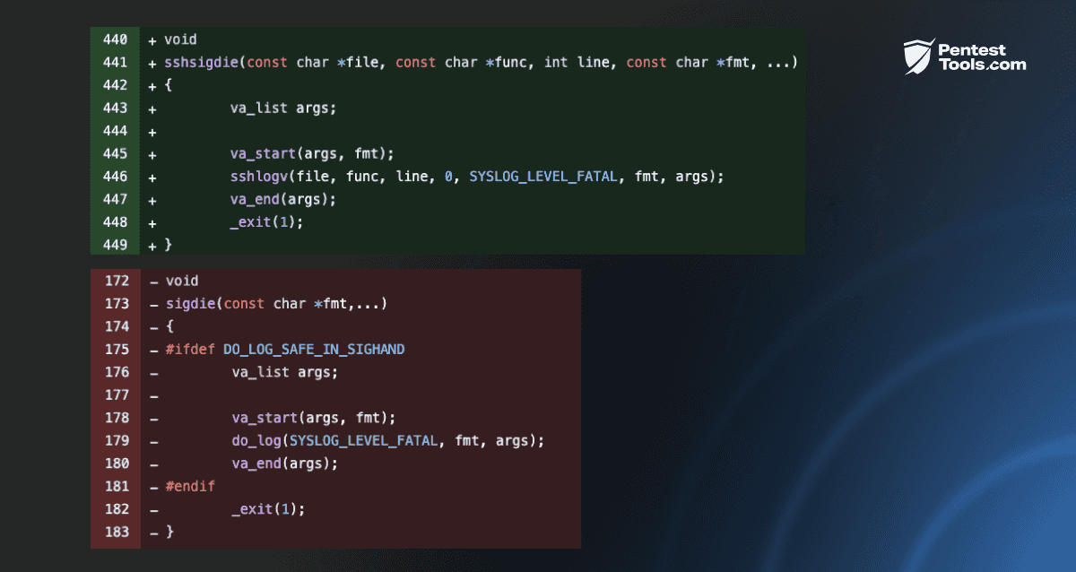 OpenSSH 8.5p1 through 9.8p1 is vulnerable again to this signal handler race condition (because the "#ifdef DO_LOG_SAFE_IN_SIGHAND" was accidentally removed from sigdie()).