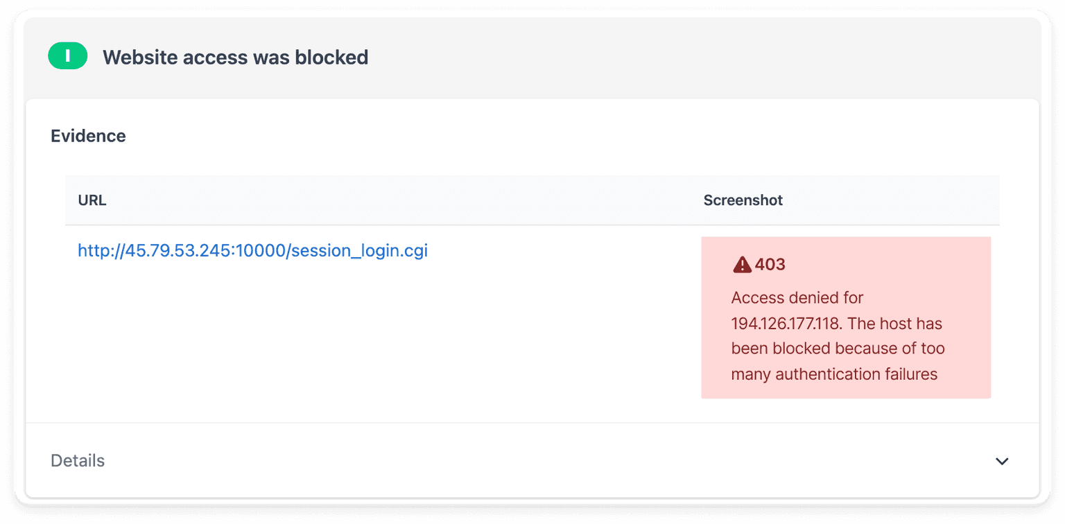 We also generate a screenshot when the bruteforce attack exceeds current capabilities, including: account lockout detection, website access blocked during the bruteforce, CAPTCHA found, Login form could not be found, and Third Party Authentication or Two Step Authentication detected.