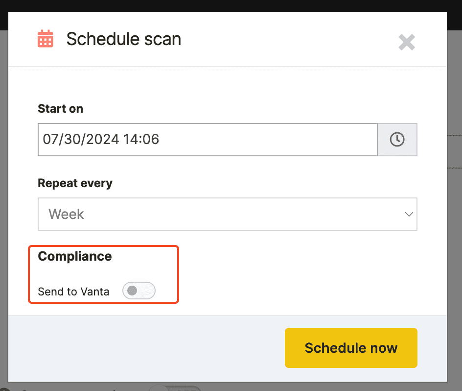 🎯 Scheduled scans automatically synced to Compliance → Documents → Vulnerability Scan (up to 5 per recurrence).