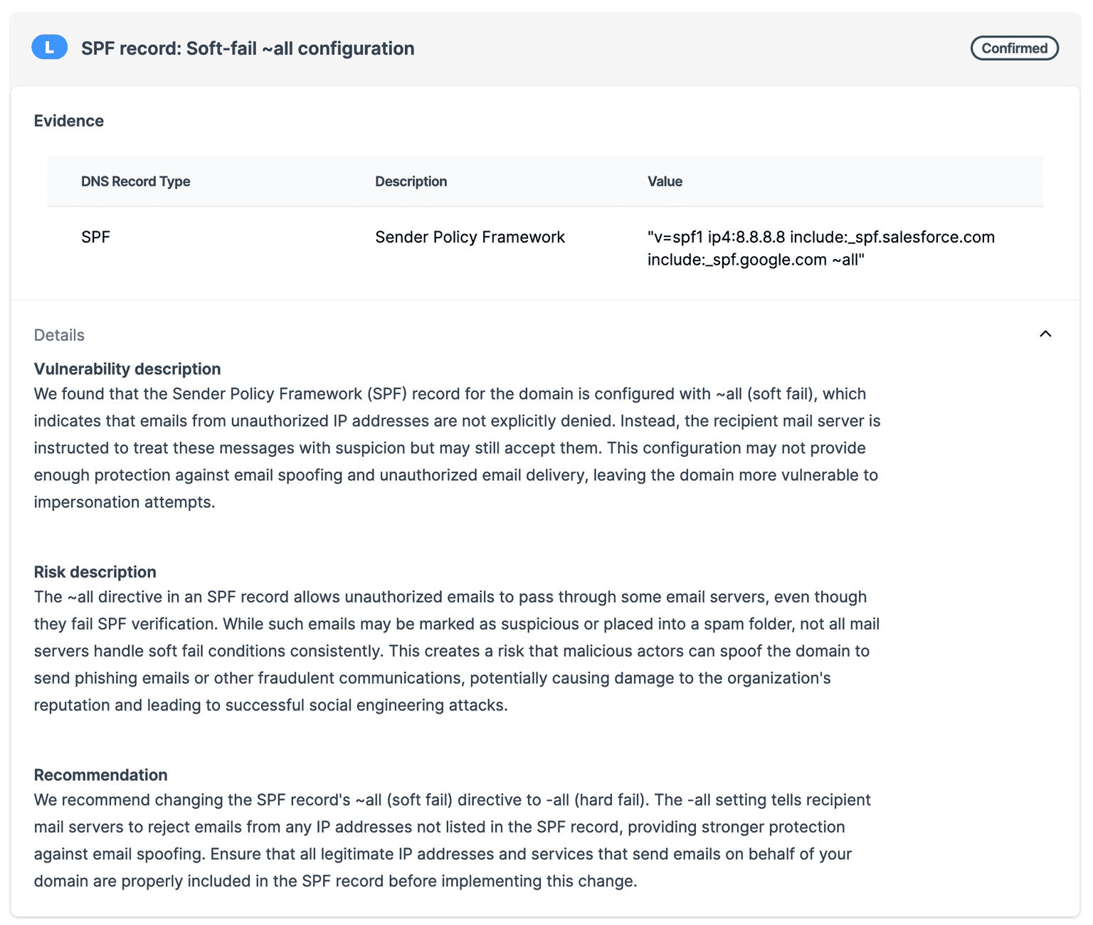 Comprehensive DNS records - see a new finding when a target has DNS records available (A, AAAA, MX, NS, SOA, TXT, SPF, CAA, CNAME) and get deeper visibility into the target’s domain structure.