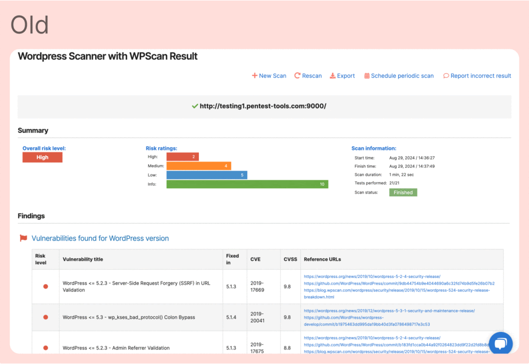 Spot outdated server software clearly – The scanner creates a separate finding for each vulnerable technology instead of lumping them together, so you can act on what matters.